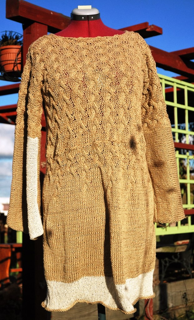 Ba, worek też z niej nie bardzo wychodzi – próbowałam, a jakże. Sukienka, widoczna na zdjęciu została wydziergana przeze mnie z pięknej, na pierwszy rzut oka, bardzo miłej w dotyku, lnianej włóczki marki Fibra Natura. Marka z górnej półki, przynajmniej tak jest opisywana i – co gorsza – wyceniana. Z bawełnianej włóczki np. Dropsa albo Alize zrobiłabym w tej cenie pewnie ze 2 takie sukienki, w których w dodatku dałoby się chodzić. W tej nie bardzo – robiona dość luźno, bo warkocze muszą mieć strukturę wyciąga się i wypycha niemiłosiernie. Kiedy próbowałam ciaśniej, była sztywna w dotyku i raczej zamieniała robótkę na sznurkową makramę z wyglądu. Moja porażka, przyznaję. Sukienka przerobiona już została na wielki szal, przypominający ponczo, do okrycia w zimne wieczory na tarasie. Nic innego z tej włóczki, wedle mnie, się nie nadawało.
