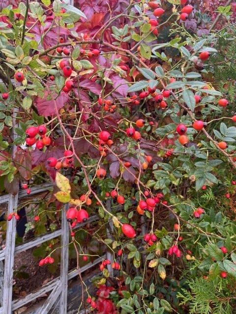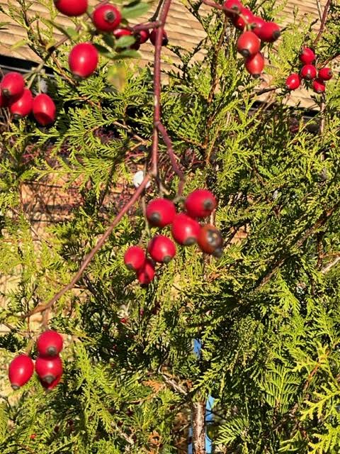 Jest za to miejsce, by pełną krasę pokazała dzika róża, której czerwone korale trwać będą aż do przyszłego roku, szczególnie pięknie wyglądające na tle iglaków (na zdjęciu tuja)