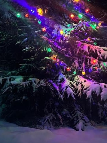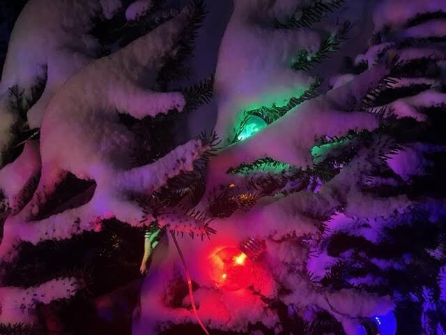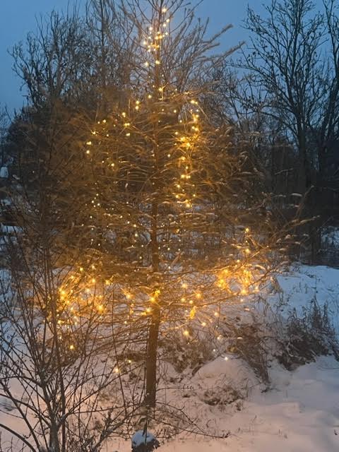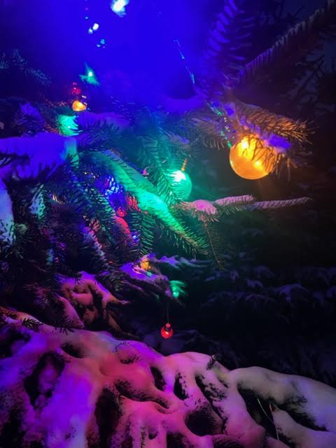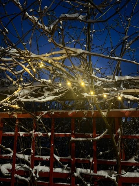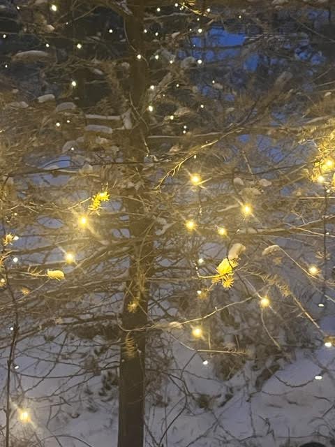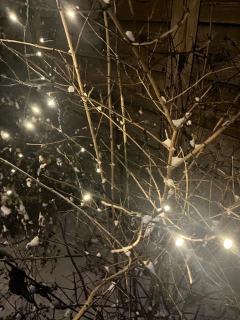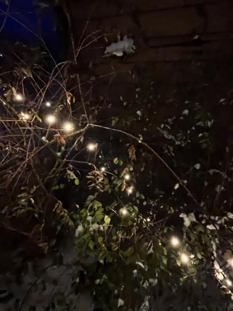 Jakoś nie bardzo idzie mi w tym roku przystrajanie wszystkiego na święta. W domu po prostu ubrana choinka. A na dworze… biało. Białe światełka, najprostsze z możliwych, bez żadnych efektów wow, po prostu świecące (u mnie tzw. ciepła biel, taka trochę retro, bo ja lubię). I tylko jeden wielki świerk daleko od domu otrzymał biżuterię z wielkich kolorowych kulek, na wyraźną prośbę dziecka. I tyle z efektów świetlnych. Zużyliśmy trzy sznury światełek i muszę przyznać, że wyglądają banalnie uroczo. Zresztą, sami oceńcie.