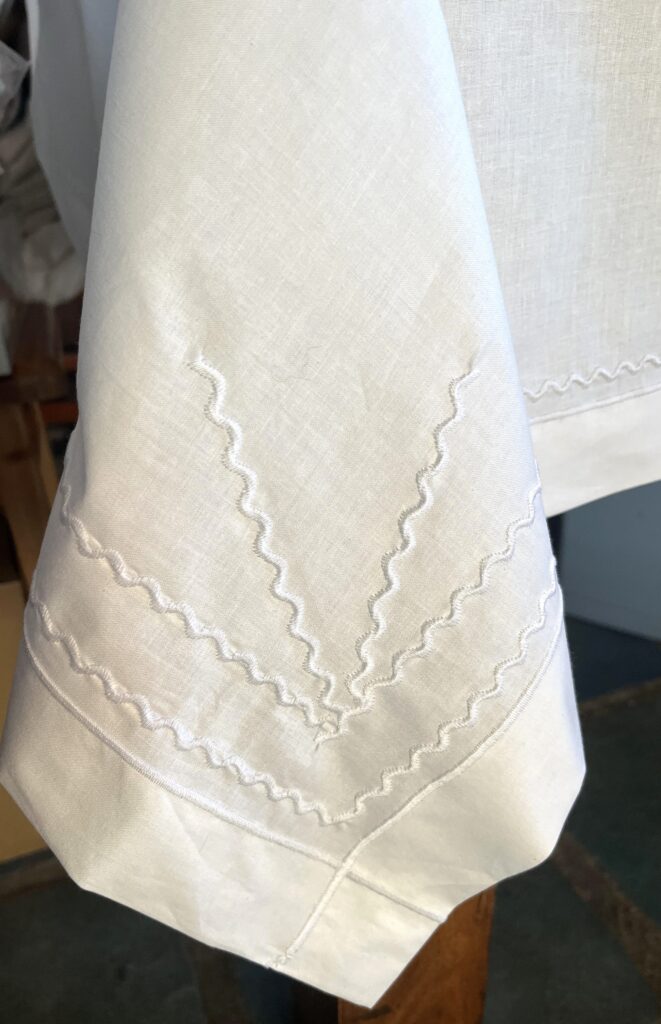 Dokoła obrusa jest listwa szeroka na 5 cm, wykończona 4-milimetrowym ozdobym, lekko wypukłym ściegiem wyszytym nicią mieniącą się w świetle perłową lekko bielą. Tą samą nicią dokoła i w rogach wyhaftowany jest elegancki wzór. Niby prosty, ale dodający temu prostemu obrusowi szyku.