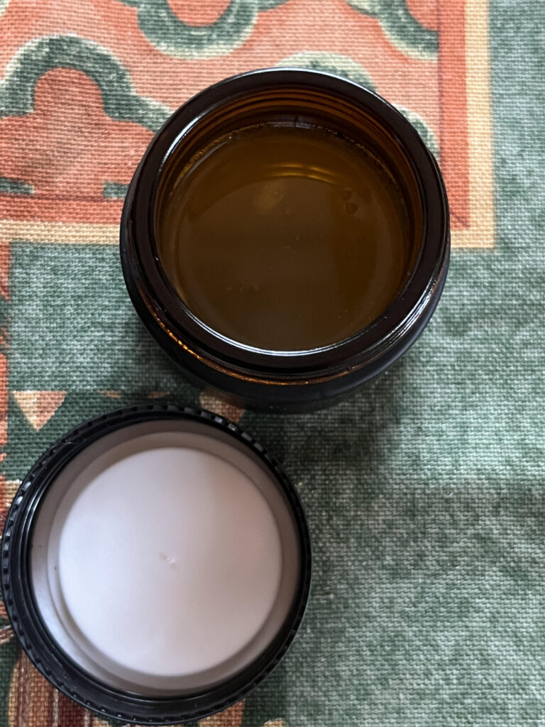 Dobrym pomysłem jest zaopatrzenie się w słoiczki szklane do kosmetyków, dostępne niekiedy w aptekach, a w internecie w dużym wyborze. To wydatek kilku złotych za jeden. Najlepsze są te z ciemnego szkła, by ograniczyć dostęp światła słonecznego, które może nam kosmetyk popsuć. Ja mam ciemnobrązowe, z czarnym wykończeniem dokoła, światła żadnego nie przepuszczą. Dodatkowo, prócz nakrętki, mają przekładkę z wypustką do jej łatwego zdejmowania, ograniczającą dostęp powietrza po otwarciu. Moim zdaniem, bardzo poręczne jak na kremy naturalne, są słoiczki o pojemności 50 ml, ale z szerokim otworem na wieczko, spokojnie zmieszczą się w nich paluchy. Pamiętajmy bowiem, że ten krem nie ma żadnego konserwantu. Duże opakowanie zrobione jednorazowo może nam zjełczeć. Oczywiście, książkowo powinniśmy nabierać krem sterylnym patyczkiem, za każdym razem wyjałowionym, ale umówmy się – zwykle używamy do tego paluchów własnych. Jeśli wcześniej zostaną wymyte wodą z mydłem nic raczej się nie stanie.